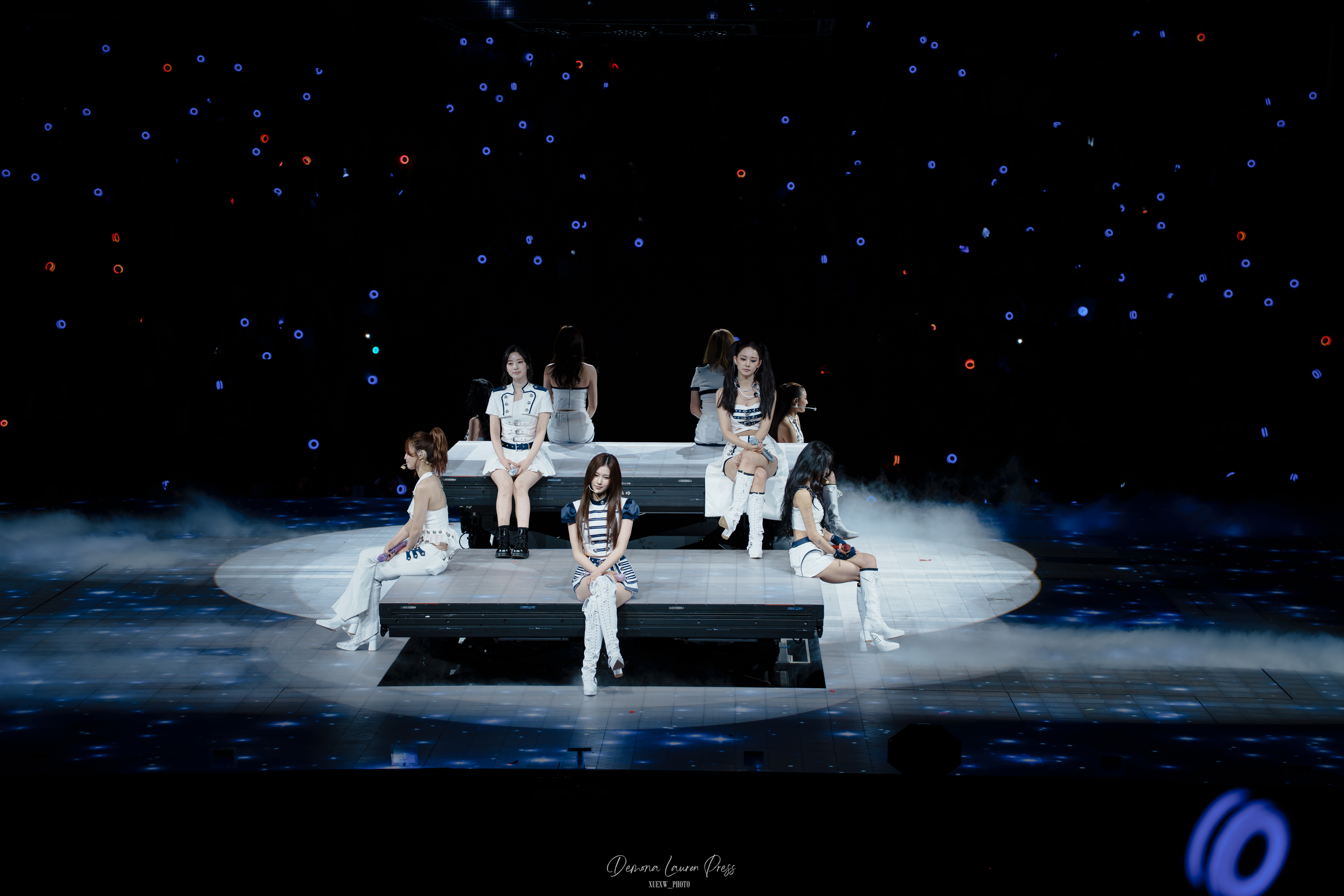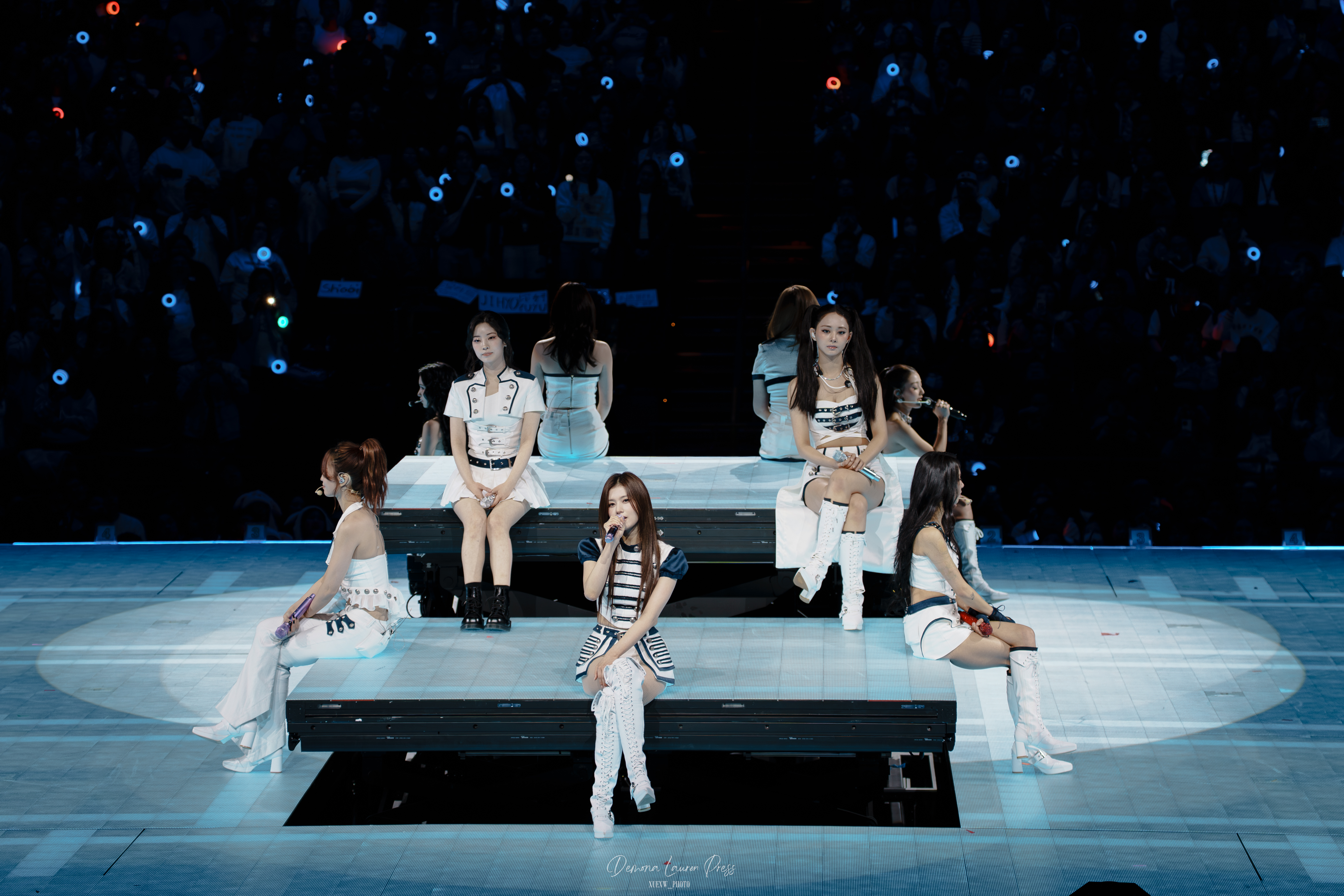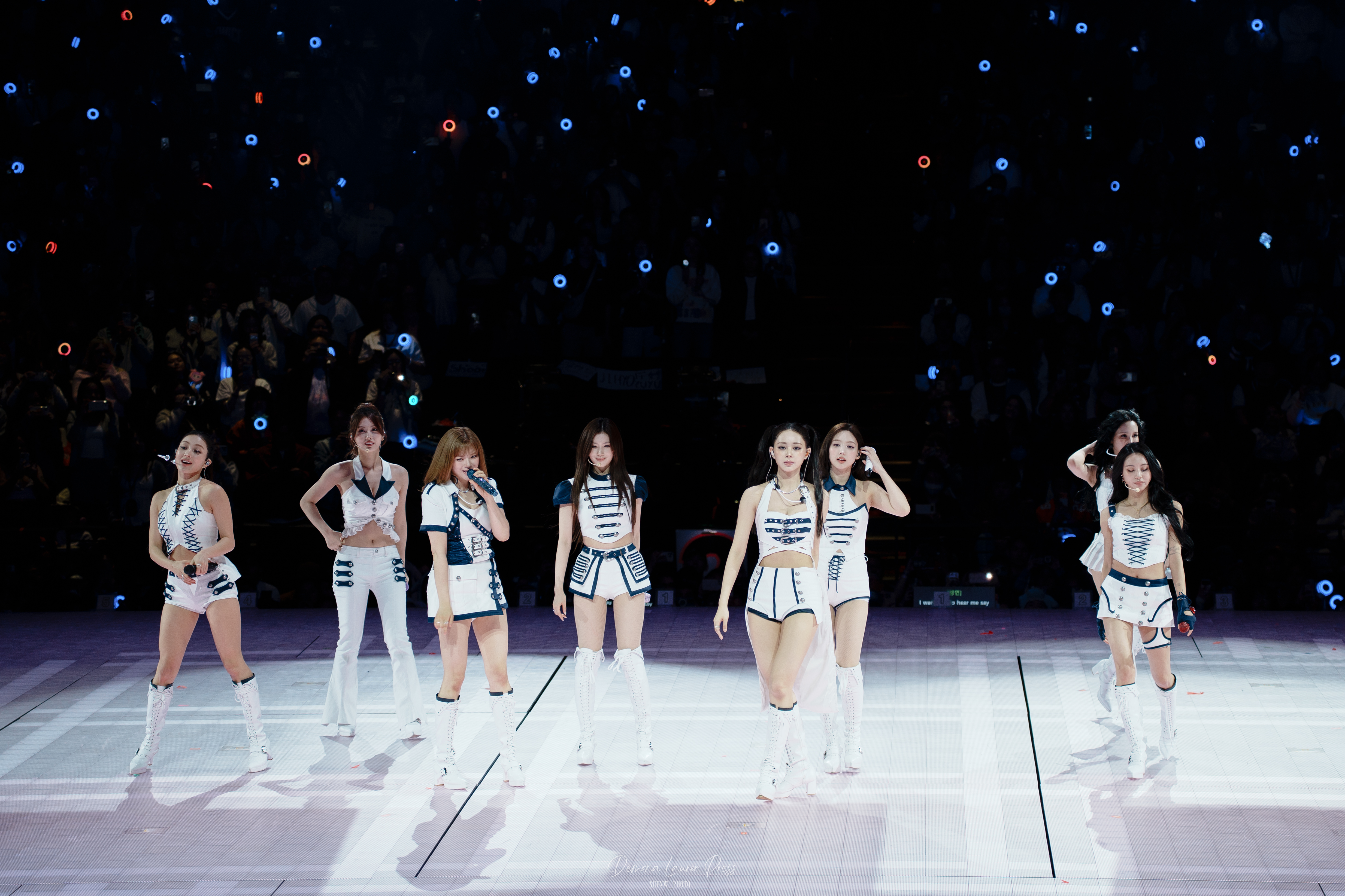 THIS IS FOR ouvre le set avec une efficacité immédiate, puis l’élan se prolonge. Les tenues bleu et blanc à esprit nautique fonctionnent parfaitement dans la rondeur, propres, identifiables d’un seul coup d’œil, chacune adaptée à la personnalité de Nayeon, Jeongyeon, Momo, Sana, Jihyo, Mina, Dahyun, Chaeyoung et Tzuyu sans casser la silhouette collective pour autant. La scène oblige à bouger, à tourner, à répondre à tous les angles, et TWICE sécurise dès les premières minutes.