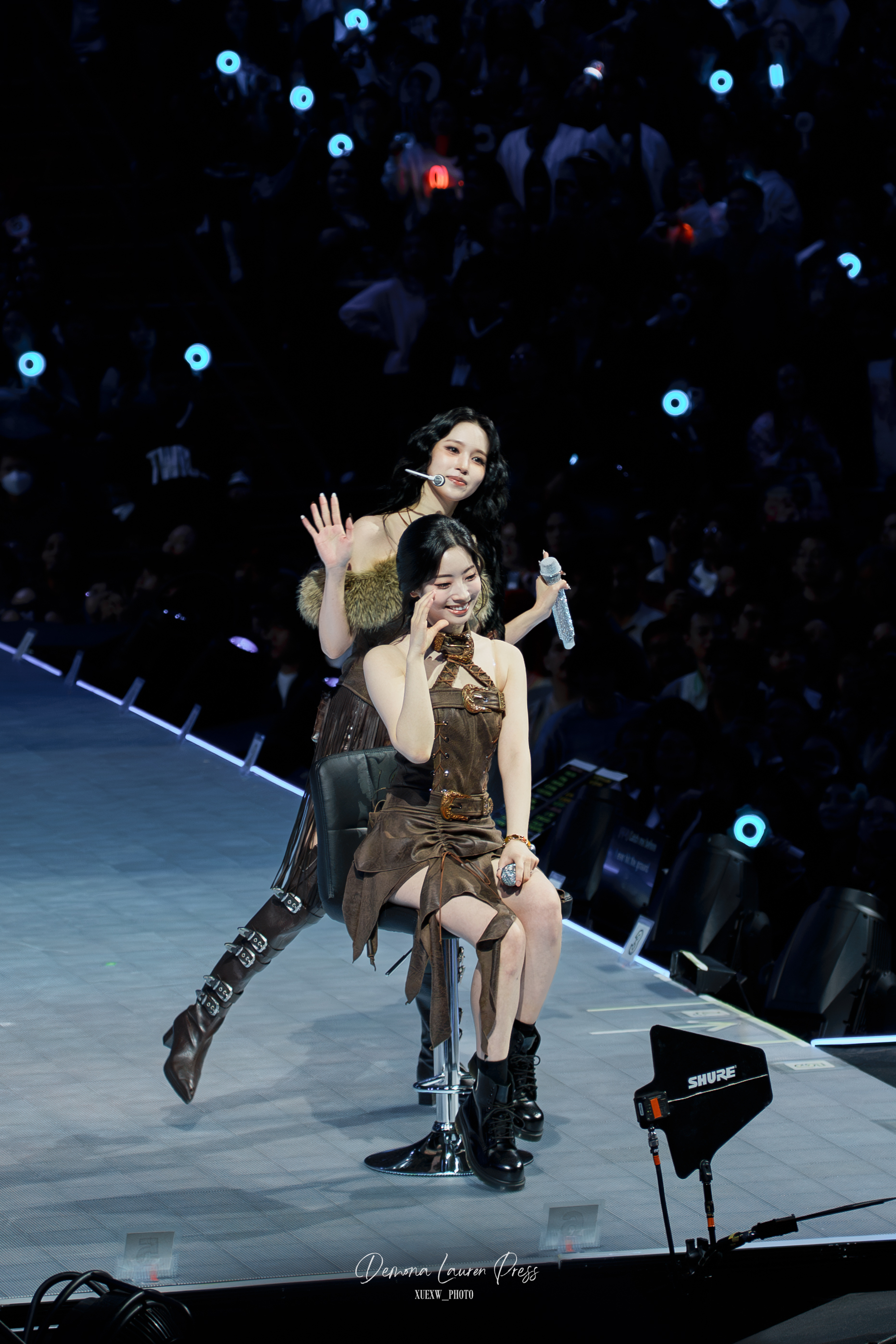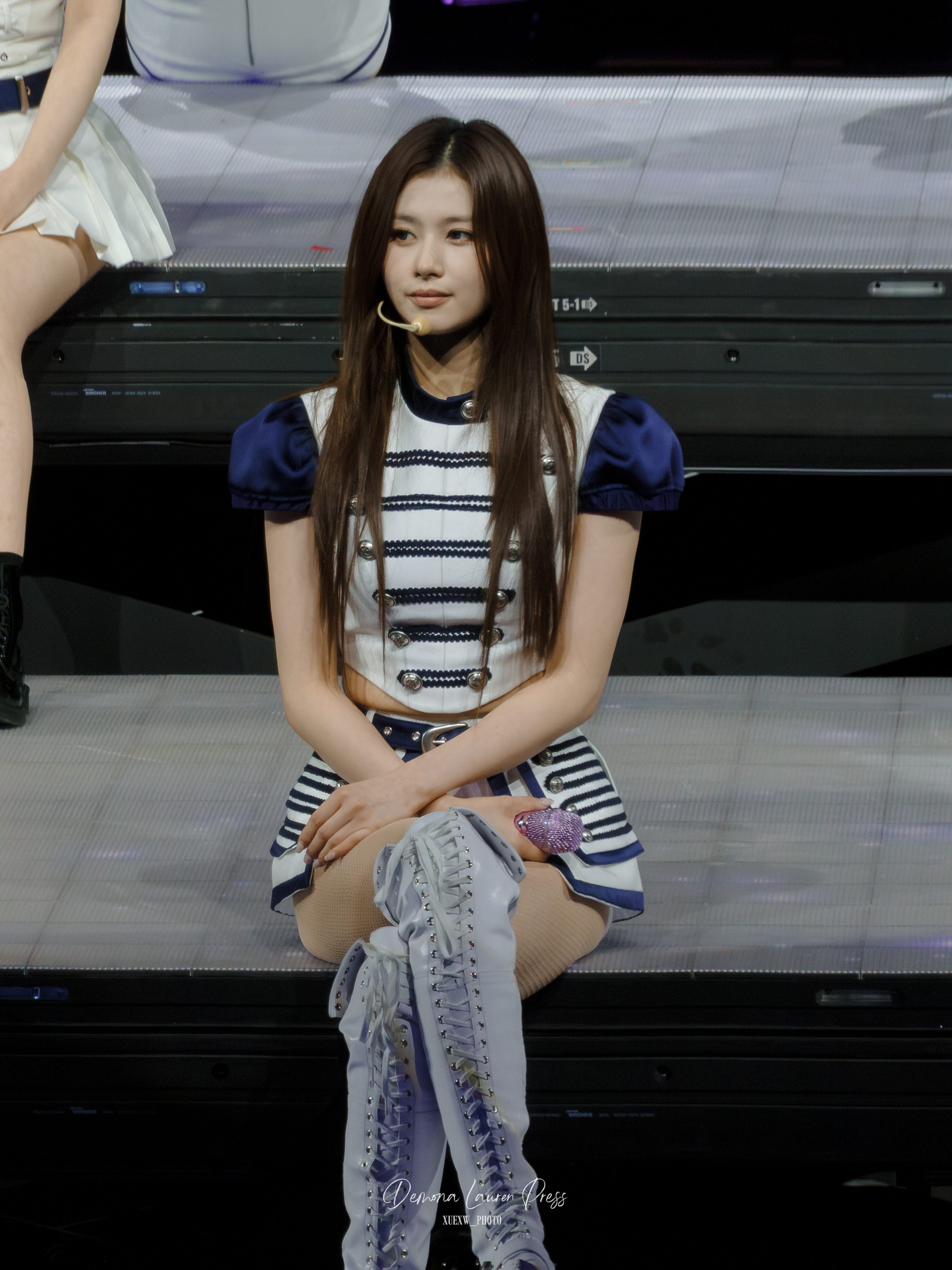Dahyun est toutefois restée assise à cause d’une blessure à la cheville, placée sur un coin de la scène. La mise en scène n’était pas construite autour de son absence. Elle chantait, suivait les gestes, gardait le rythme comme une mémoire corporelle. Le groupe s’est adapté sans dramatiser, et cette sobriété a renforcé l’impression de solidité.