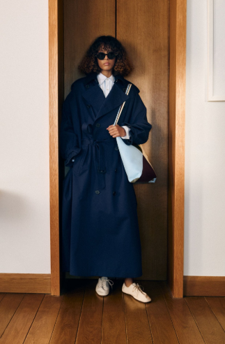 Les accessoires prolongent l’idée. Une paire de work boots à lacets avec détail steel toe cap côtoie des ballerines brodées, des loafers classiques, et une chaussure hybride, entre ballerine et derby, en toile ultra légère, presque slipper. Côté sacs, un grand tote en toile et sa version bucket sont entièrement réversibles, finis par des trims en cuir contrasté. Là encore, l’objet reste fonctionnel, mais reste une pièce à part entière.