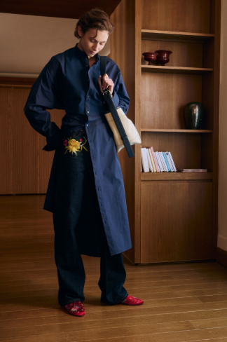 Le travail sur la matière reste concret. Le denim selvedge japonais continue, parfois volontairement sunbleached pour obtenir un effet patiné, comme si la pièce avait déjà vécu. Les cowboy shirts se chargent de broderies florales et de piping contrasté. Des vestes au vocabulaire militaire s’adoucissent par des détails de boutons plus délicats. L’ensemble tient une promesse simple, un vêtement doit rester portable, mais il doit aussi porter une vision de coupe.