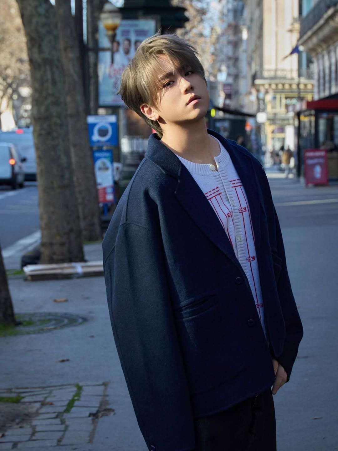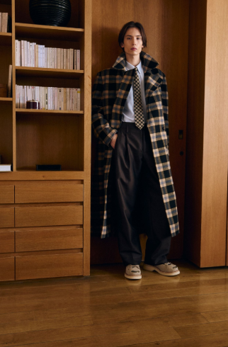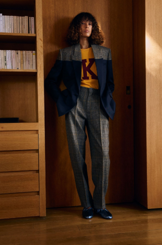 Dans un second look, plus intérieur, à la villa KENZO, un manteau bleu nuit aux épaules souples enveloppe un cardigan crème boutonné, traversé par un motif rouge qui évoque un motif plus technique. Denim brut à revers, chaussures noires épaisses, l’ensemble s’affirme par la densité des matières et une palette à la fois cosy, sobre, mais un zeste nostalgique. C’est une manière de montrer que KENZO peut aussi se lire tel quel, par la coupe et la tenue, en revenant aux sources de la matière. Tout simplement.