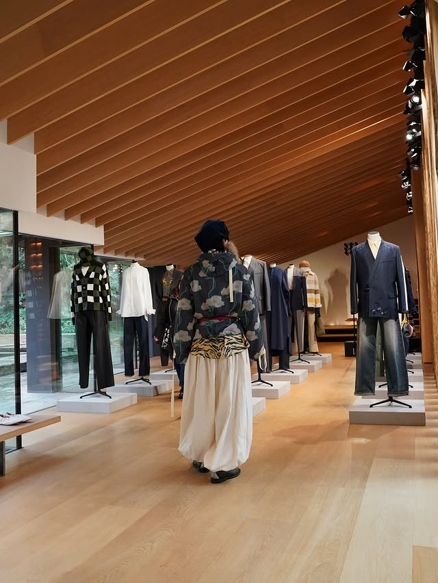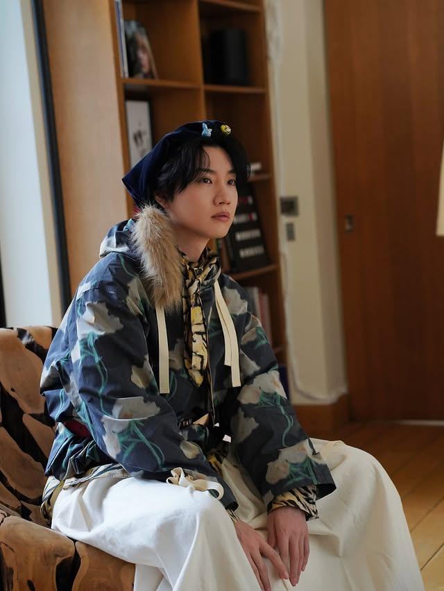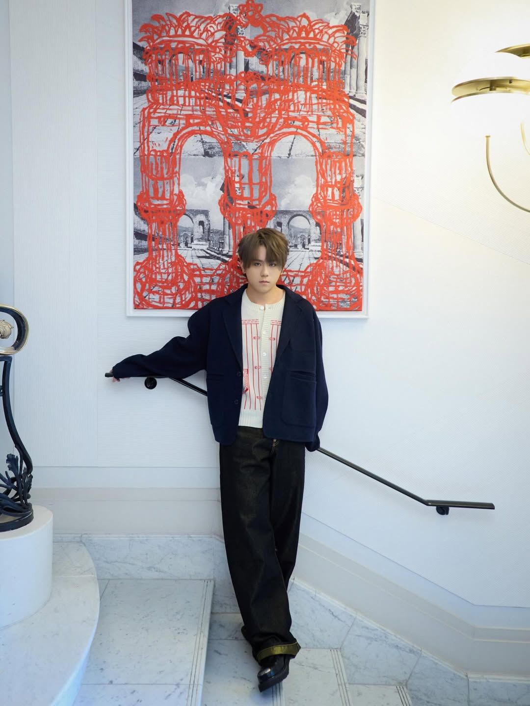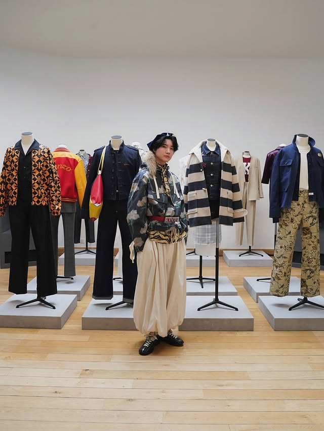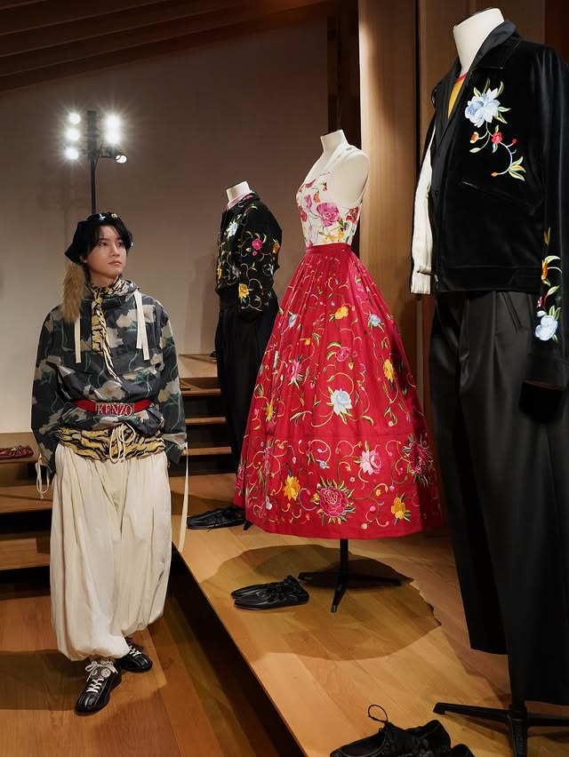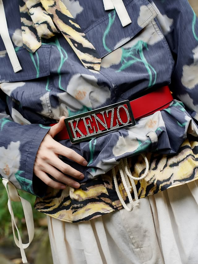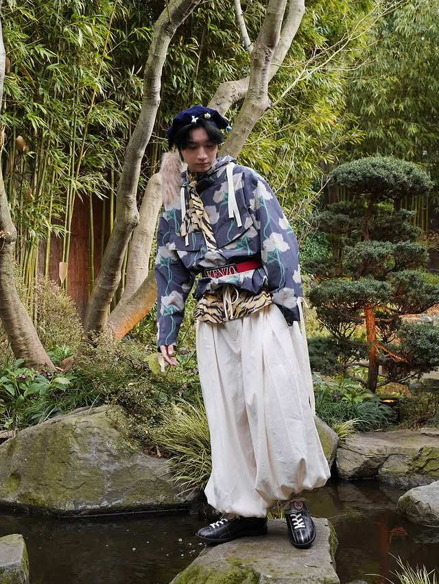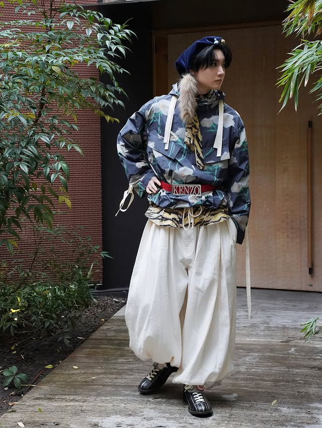 Dans ce cadre, les tenues portées par des invités deviennent des preuves de portabilité. Dori Sakurada, ami de la maison KENZO, arrive avec nonchalance dans l’après-midi et se prête à un essayage où l’archive et le jeu se lient d’amitié. Une veste à capuche au floral oversize, traitée comme un imprimé d’extérieur, se superpose à un foulard à motif animalier noué près du cou. Le bas, blanc, ample et ballonné, évoque à la fois un pantalon de travail et une construction plus japonaise dans la tenue du volume. Un ceinturage rouge KENZO coupe la silhouette et rappelle la dimension varsity sans passer par la veste universitaire attendue.