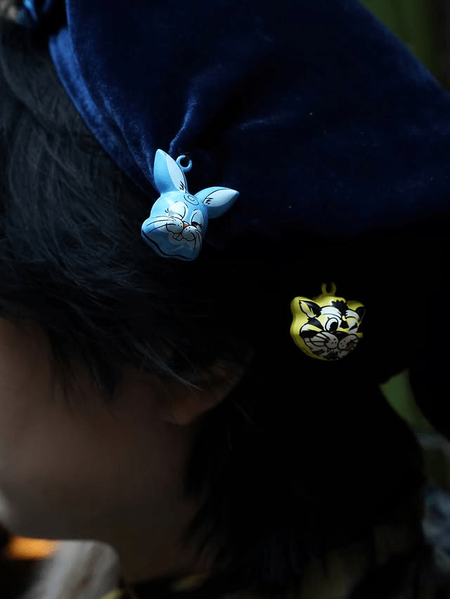Le détail le plus parlant se situe sur la tête, stylisé par Ramona Eschbach. Une capuche bleu nuit ponctuée de petits charms, dont un lapin et un tigre, introduit le bestiaire KENZO sous une forme intime, presque talismanique. Un élément de fourrure ajoute une note tactile et renforce l’idée d’un vêtement pensé pour la météo et la froidure, sans perdre de ses couleurs.