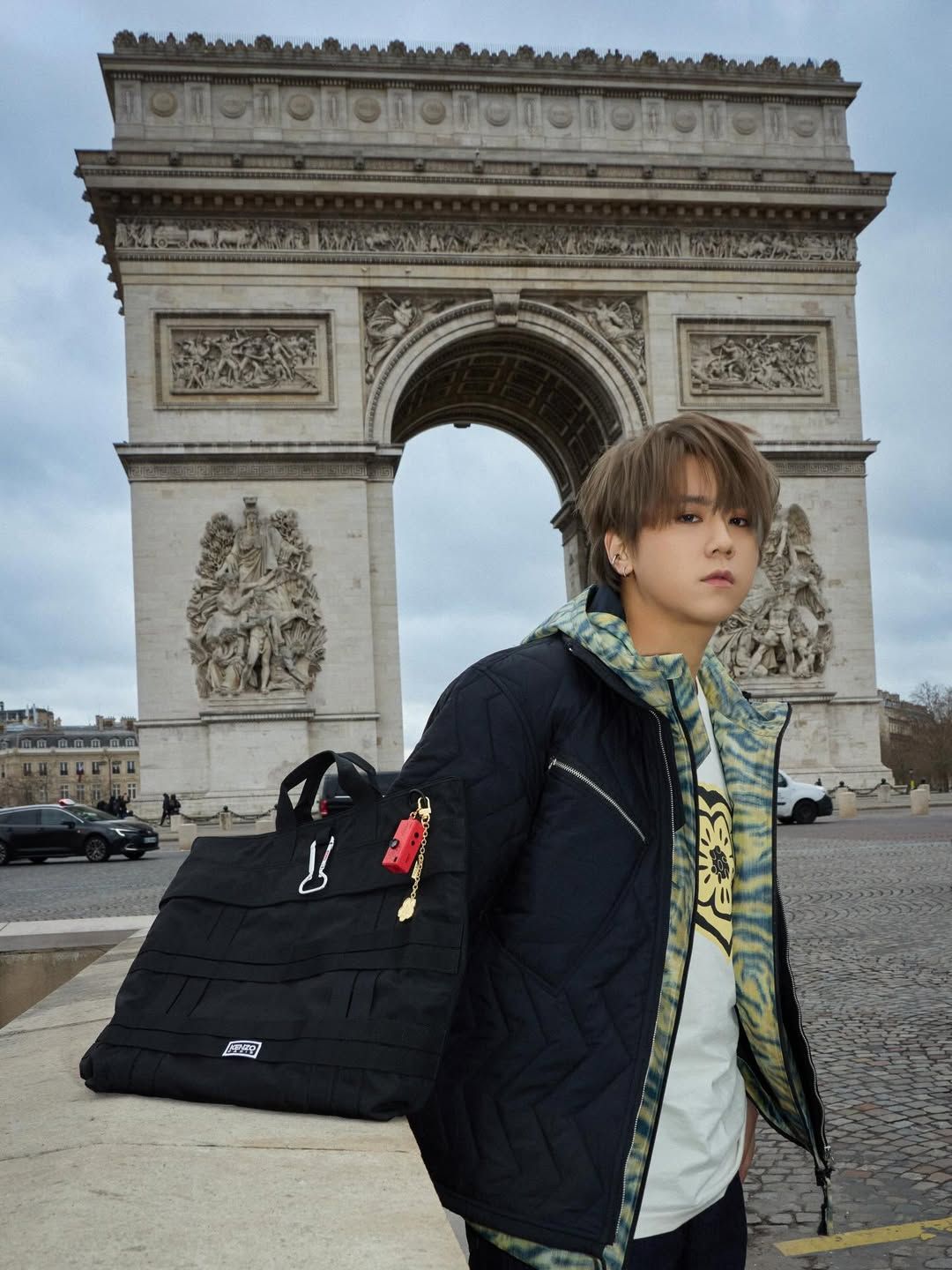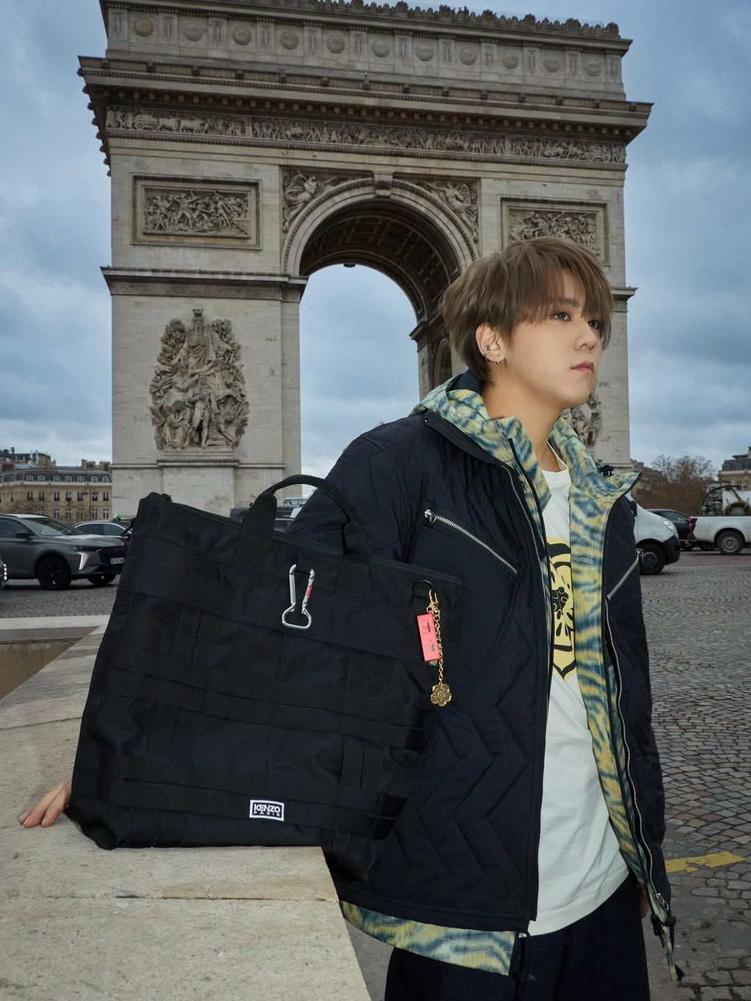Keung To, arrivé également dans l’après-midi avant de revenir le soir après quelques clichés dans Paris, propose une lecture plus urbaine, plus organique et épurée. En photoshoot près de l’Arc de Triomphe (photo courtesy KENZO), il porte un puffer noir à volume contenu, capuche doublée d’un imprimé, t-shirt blanc avec motif central jaune, et surtout un grand tote noir à construction utilitaire, poches, sangles, anneaux, étiquette rouge. La silhouette parle de déplacement et de quotidien, et rejoint l’idée formulée par Nigo, « home » comme worldview portable.