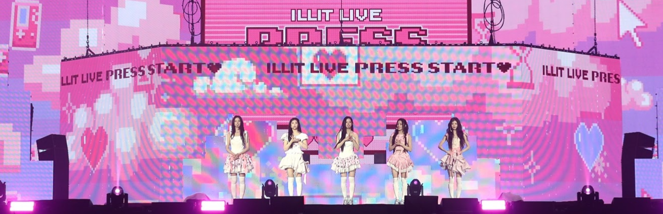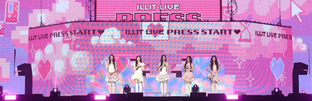 Deux concerts complets à Séoul les 14 et 15 mars pour commencer pour le groupe signé BELIFT LAB. Le show reprend un imaginaire de jeu vidéo, avec l’idée de “niveaux” qui s’ouvrent au fil du concert, et une histoire très simple. Sortir d’un monde virtuel pour venir au contact du public, les GLITTs. Le set dure 120 minutes et fait le tour du répertoire d’ILLIT, des titres les plus connus aux faces B.